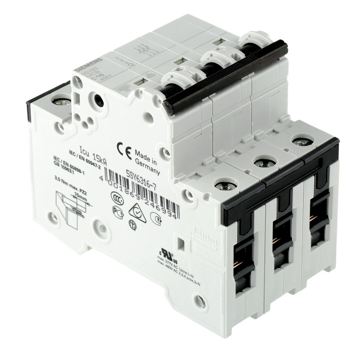 Wyłącznik nadprądowy MCB, Typ C, 3-biegunowy, 15A, 400V, 60V, Siemens, 5SY6