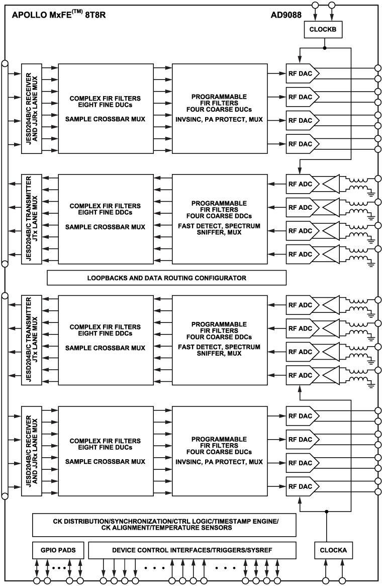 Apollo MxFE Octal, 16-Bit, 16 GSPS RF DAC and Octal, 12-Bit, 8 GSPS RF ADC