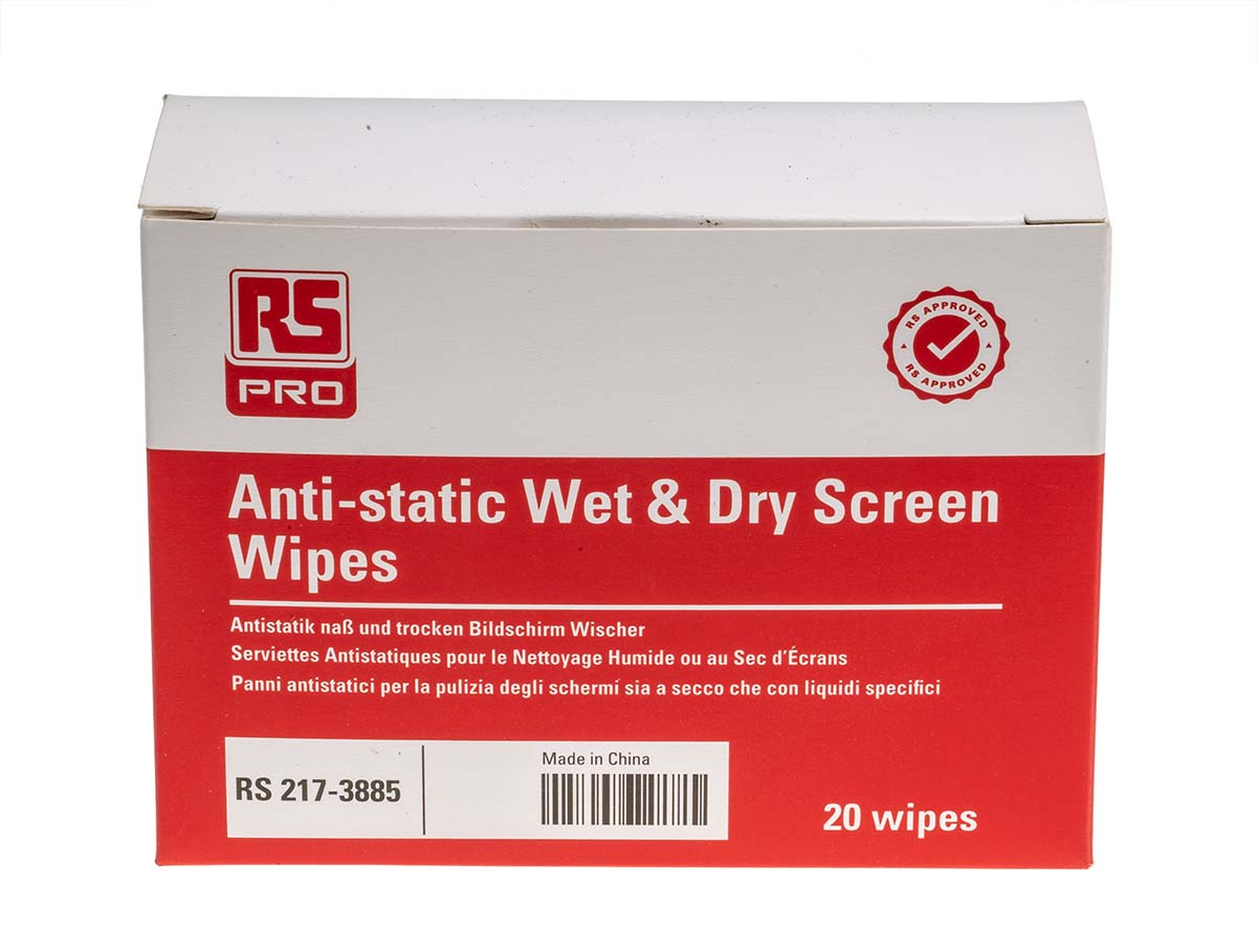 11. Chusteczki RS PRO Ekrany komputerowe, sprzęt biurowy, plastik, filtry ekranowe Na mokro 20-szt. Chusteczki do ekranów 71.73