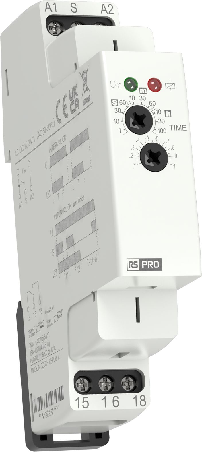 2. Timer Relay Montaż na szynie DIN 12 → 240V ac/dc SPDT 1-stykowy RS PRO 0.1 s → 100h 1 funkcyjny 218.52