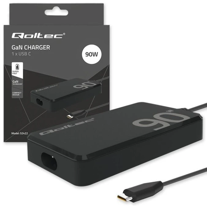 15. Qoltec Ładowarka sieciowa 90W GaN Super Fast SLIM PD 5-20V 4.5A USB-C 3.1 Laptop MacBook Smartfon + kabel 93.87