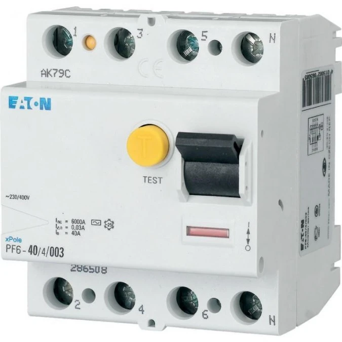 5. Wyłącznik różnicowoprądowy PF6 3-fazowy 63A 30mA typ A 4-biegunowy 4P (400V AC) 4-modułowy EATON 286512 267.34