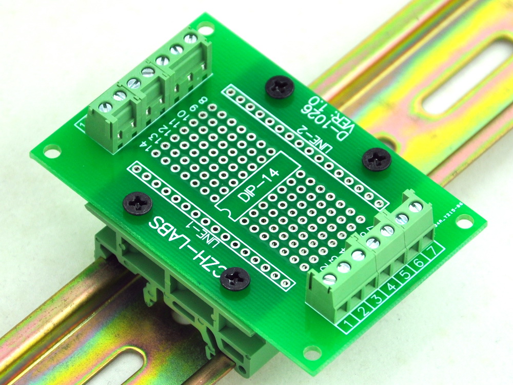 DIP-14 Component to Screw Terminal Adapter PCB, w/Simple DIN Rail Mount Bracket.
