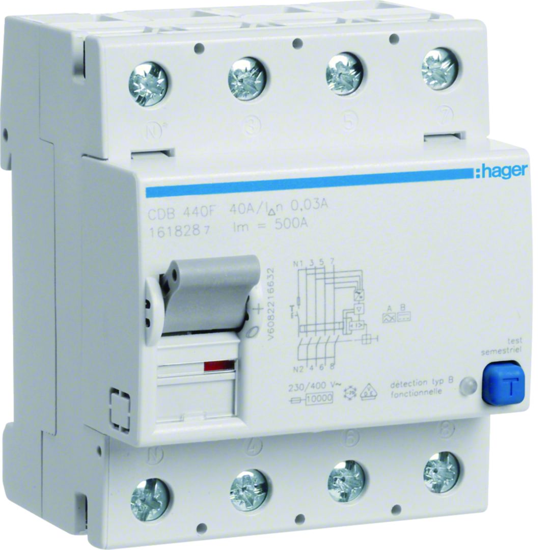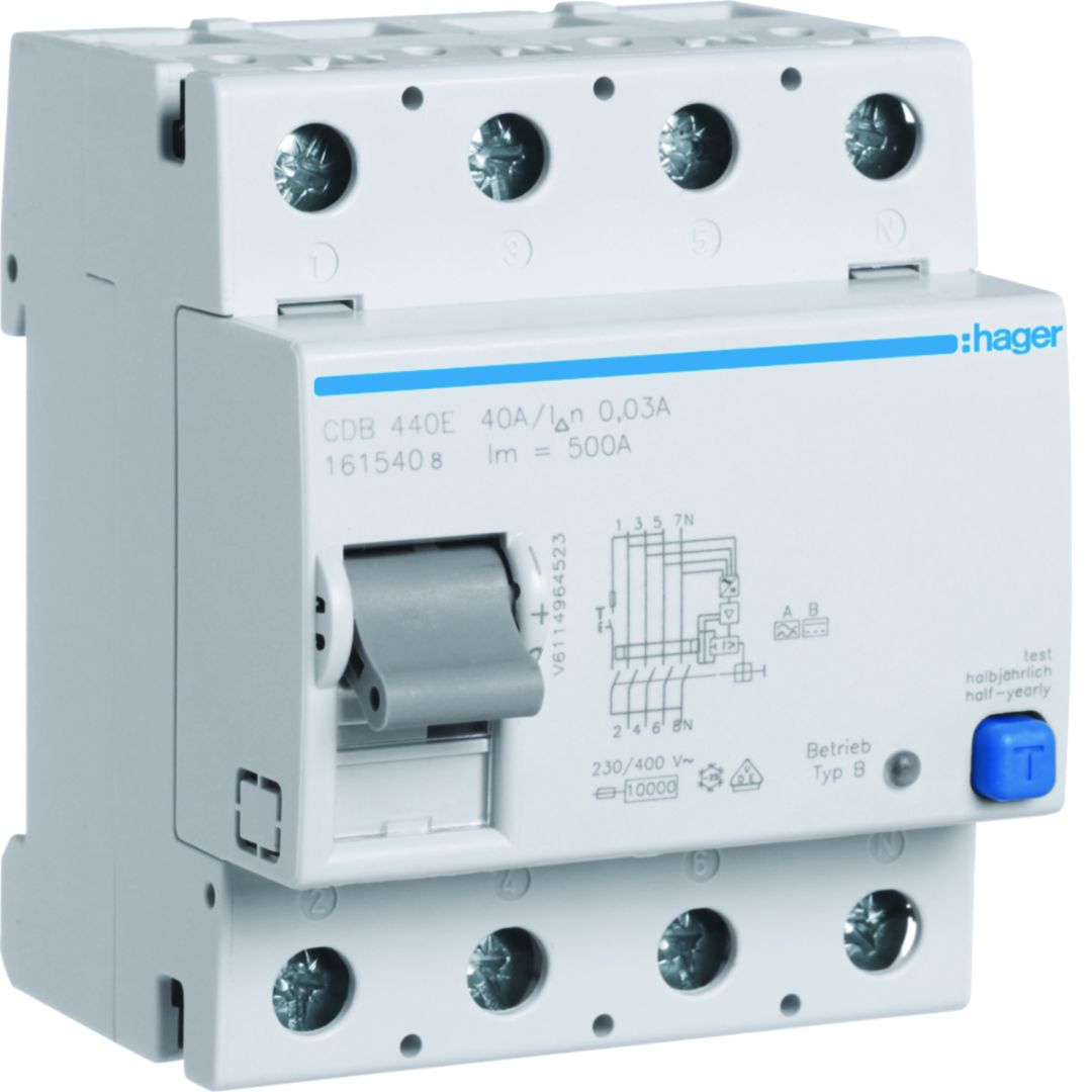 10. RCCB, Typ B, 4-biegunowy, 40A, 30mA, Hager, CDB 230 → 400V ac 7007.97
