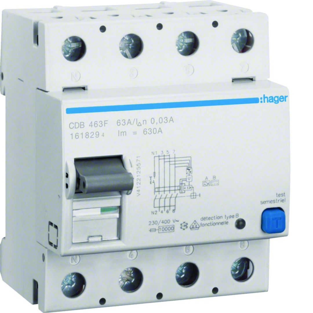 13. RCCB, Typ B, 3P+N-biegunowy, 63A, 30mA, Hager, CDB 230 → 400V ac 8860.54
