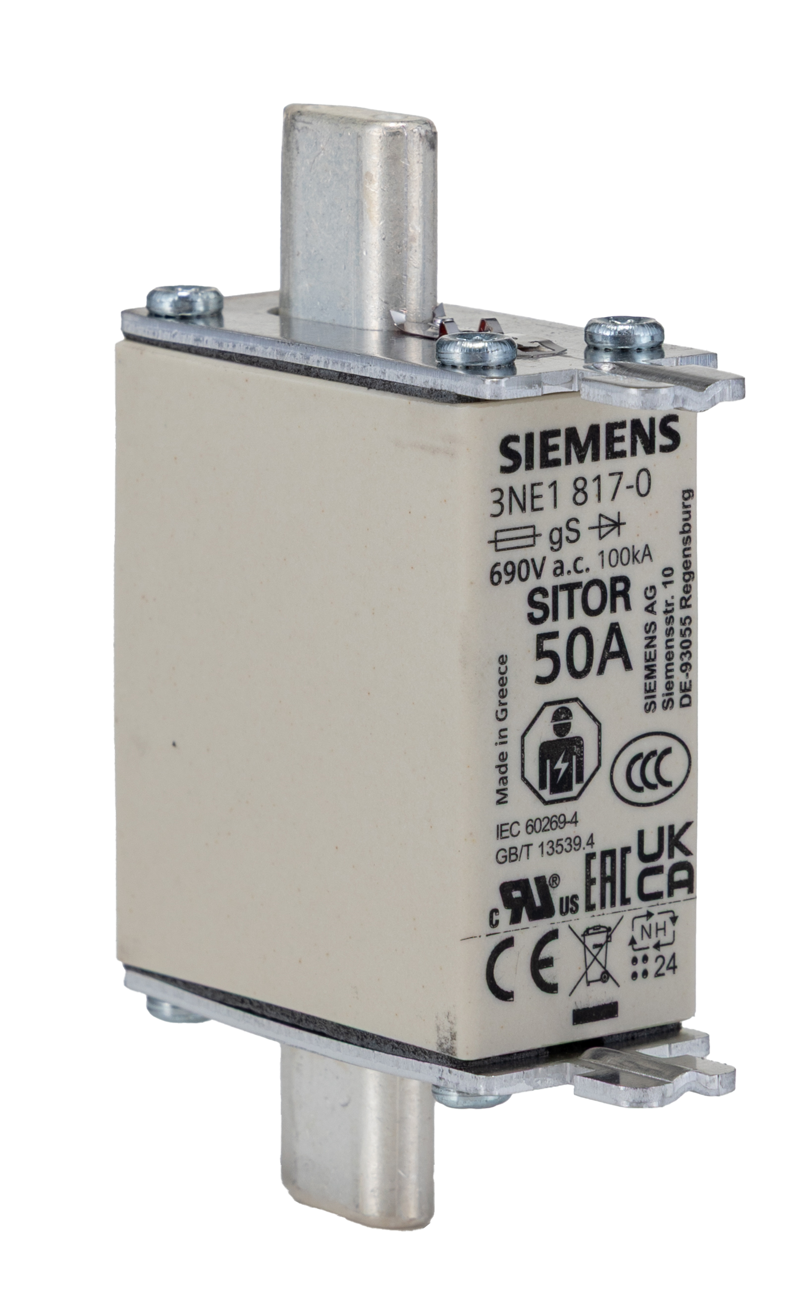 Bezpiecznik z wyśrodkowanym wyprowadzeniem 50A 690V ac NH000 gR - gS Siemens