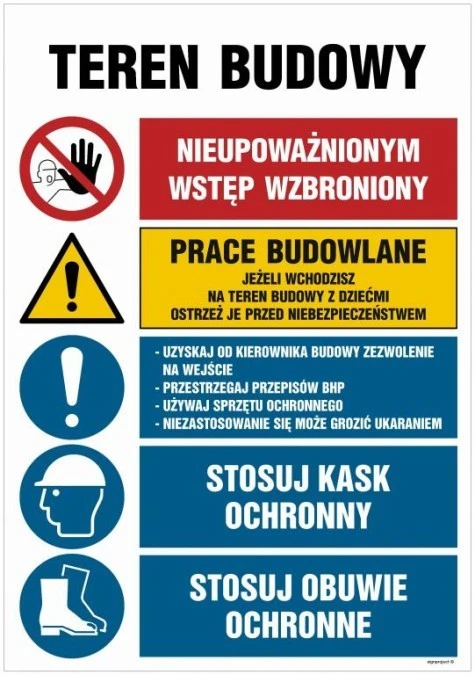 ZNAK - OI007 Teren budowy, Nieupoważnionym wstęp wzbroniony, Prace budowlane, Jeżeli wchodzisz na teren budowy z 70 x 105 cm PN