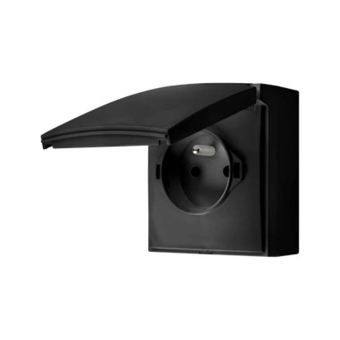 Simon Aquaclick Gniazdo IP44, pojedyncze z uziem., szybkozłącza, klapka w kolorze, z przesł. torów prąd. czarny ACGZ1CZ/49