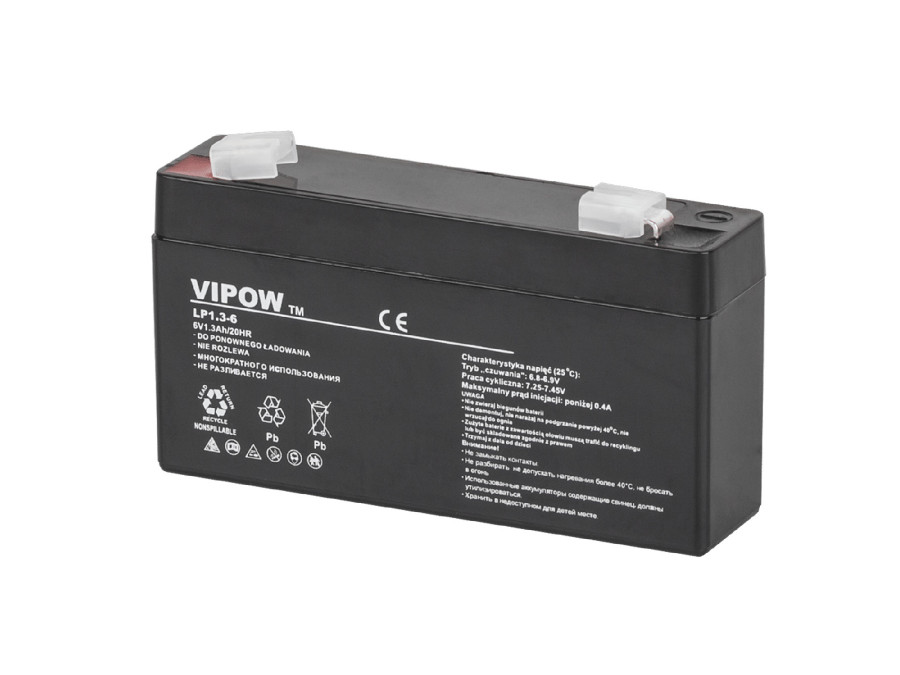 Akumulator; 12V; 1,3Ah; kwasowy bezobsługowy AGM; LP1.3-12; 97x43x53(58)mm; konektor 4,8 mm; 0,59kg; VIPOW