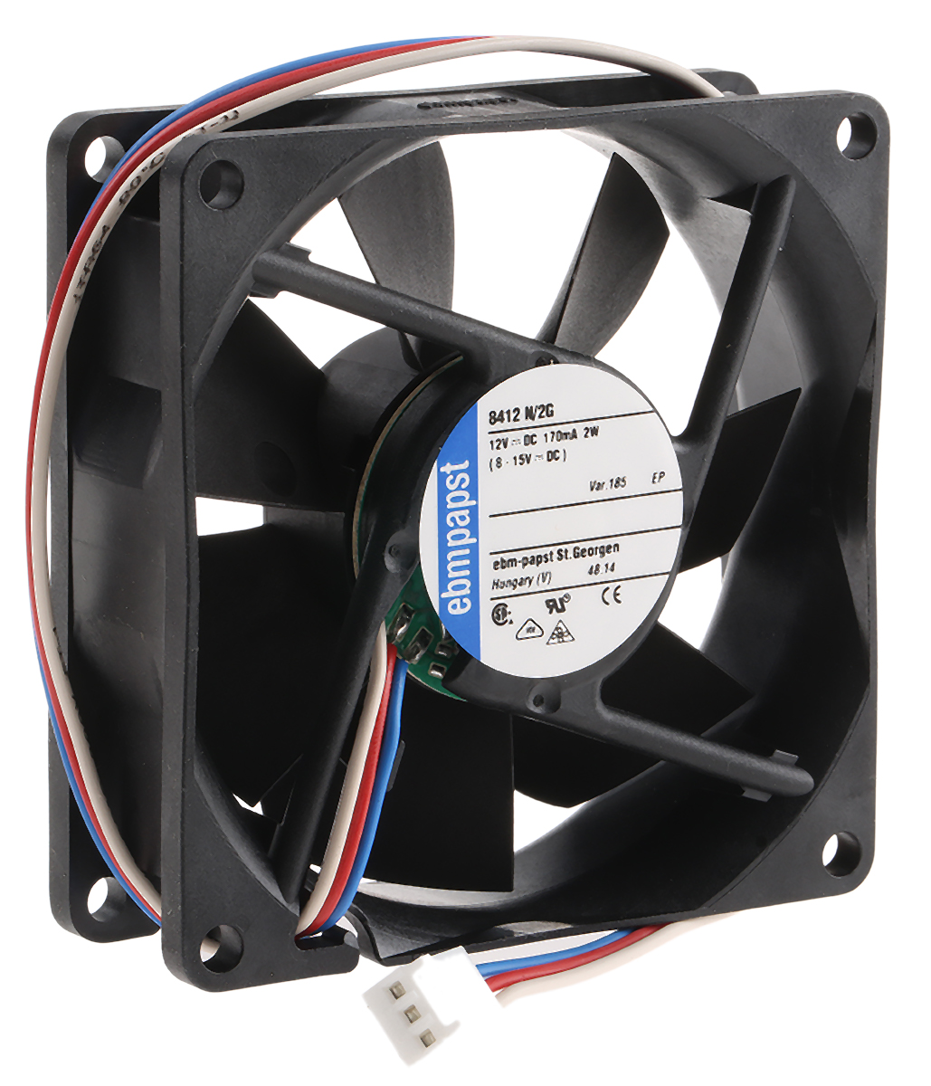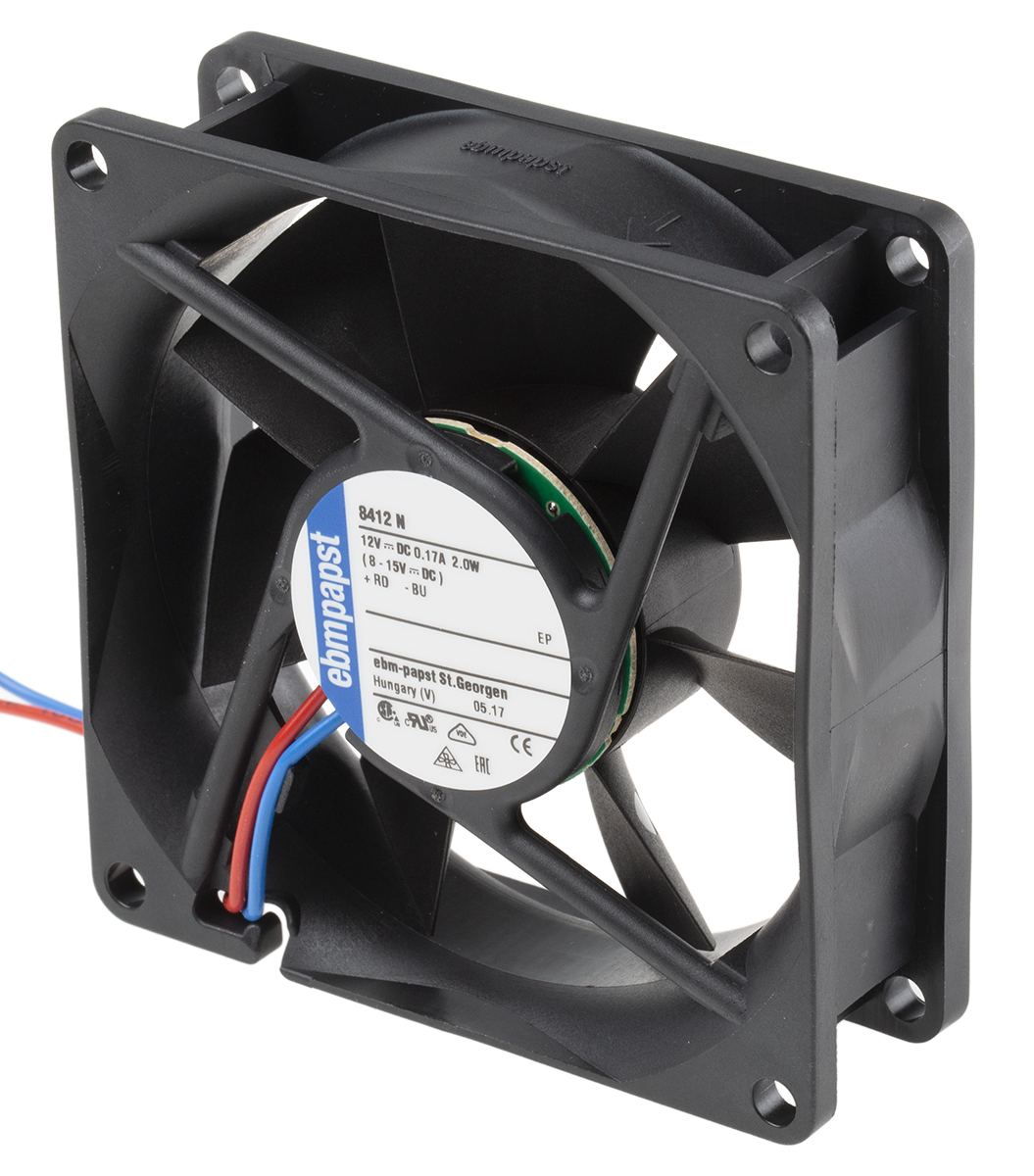 8. DC axial fan, 12 V, 80 x 80 x 25 mm, 69 m³/h, 32 dB, slide bearing, ebm-papst 8412 N/2G 189.67