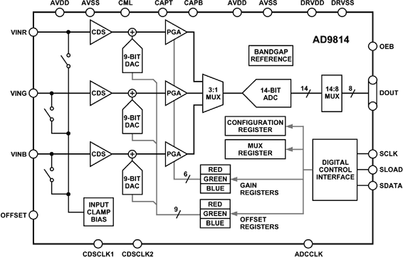 Low Power 14-Bit, 3-Channel CCD Signal Processor with Progammable Serial Interface and Byte-Wide Data Output Format