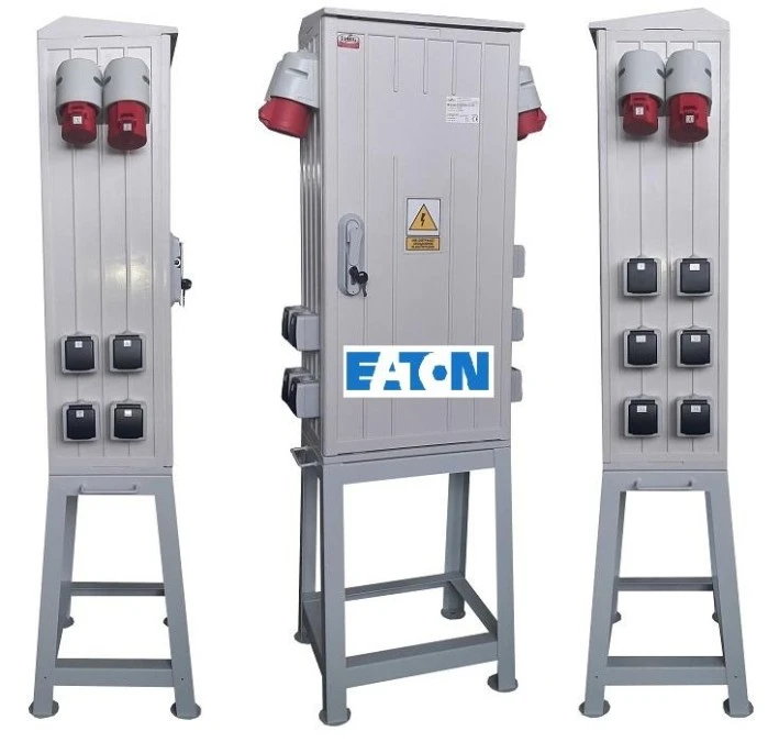 Rozdzielnica elektryczna budowlana na stojaku (8x2P+Z, 2x16A/5P, 2x32A/5P, 1x63A/5P) + rozłącznik, RB40x80-K160-01228Z-P0-R