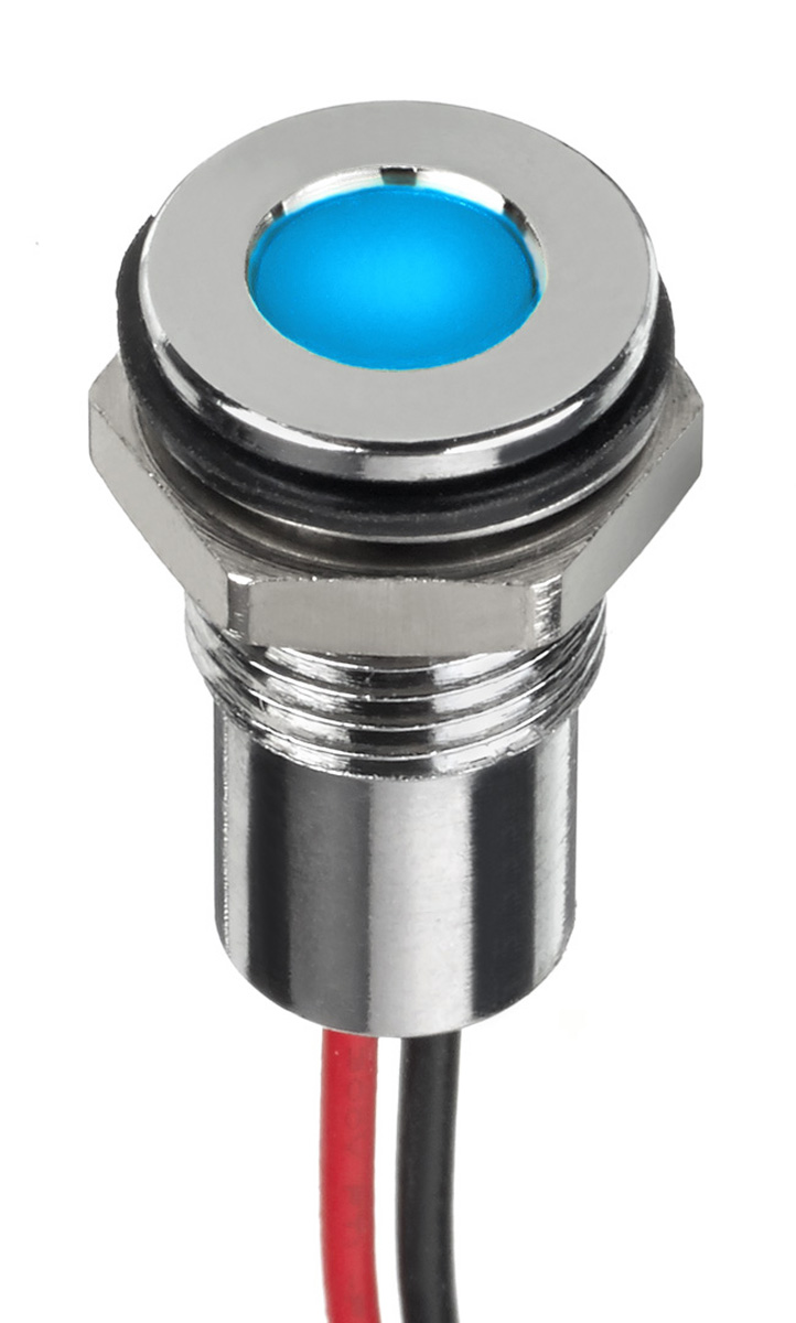 14. Lampka kontrolna do montażu panelowego 24V dc, niebieska 8mm LED Chrom Wyprowadzenia RS PRO 94.01