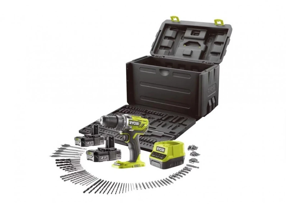 Zestaw Ryobi Wiertarko-wkrętarka akumulatorowa 18V 2x2.0Ah + akcesoria i pudełko do przechowywania
