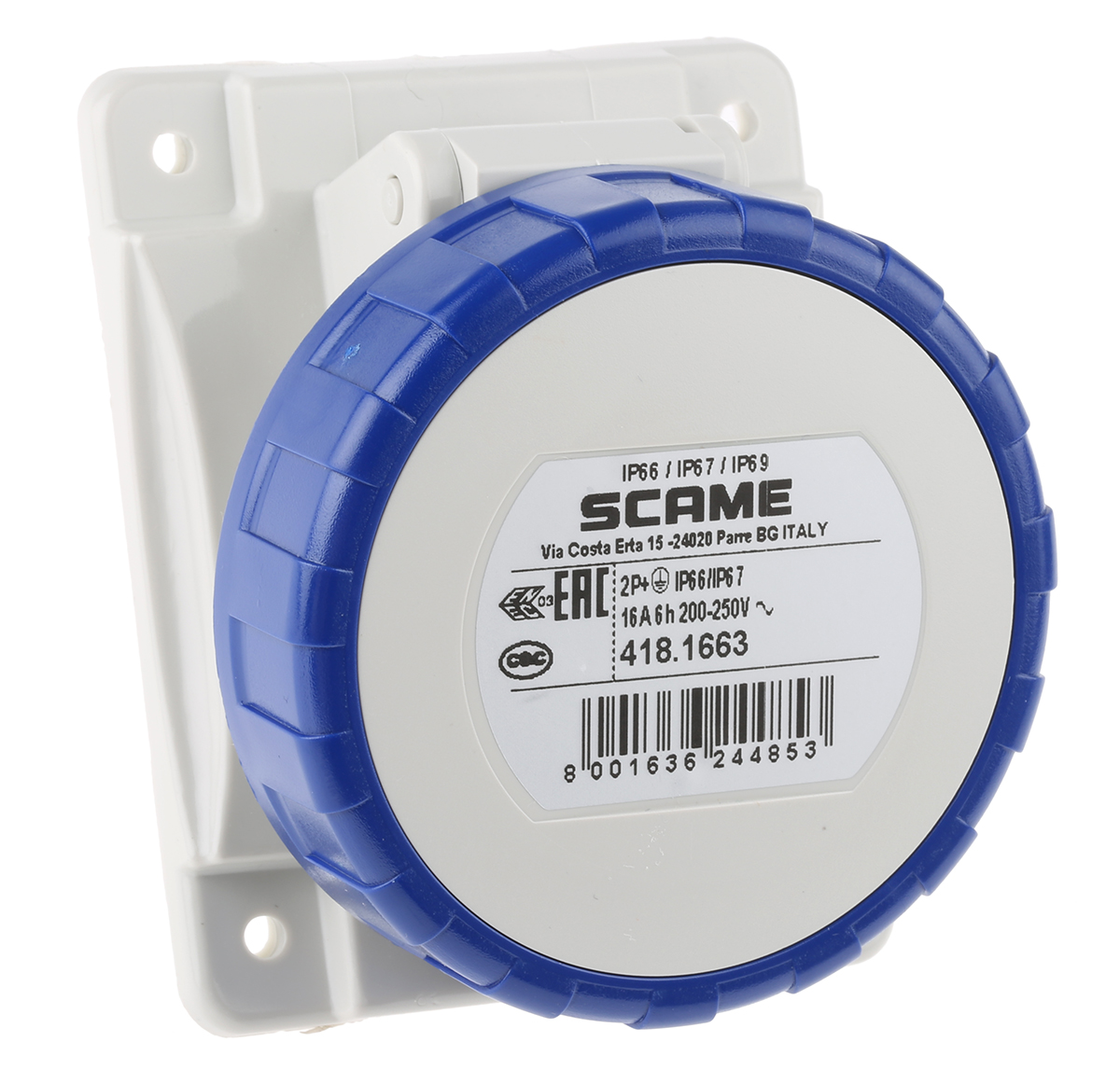 Wzmocnione złącze zasilania 16A Gniazdo 230 V 2P + E Żeński Scame Niebieski Montaż na panelu, IP67