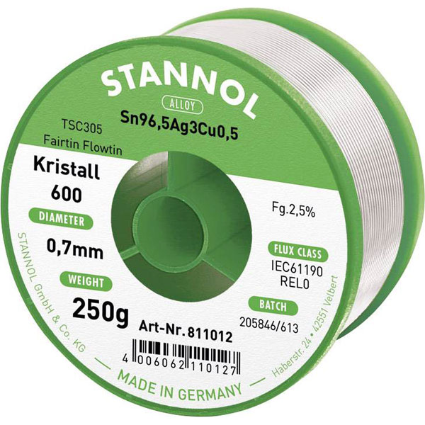 Stannol 811012 Kristall 600 Solder 0.7mm Lead-Free Sn96.5Ag3Cu0.5 250g